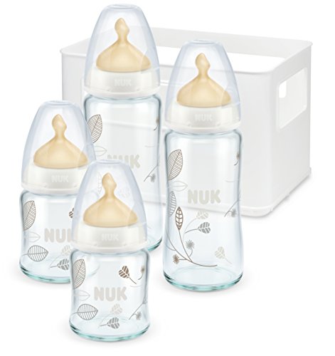 NUK FIRST CHOICE starter set glass with 4 anti-colic baby bottles (2x 120 ml and 2x 240 ml) incl. Latex hoods and bottle box Includes 4 NUK FIRST CHOICE wide mouth bottles made of glass with attractive motifs and colors, BPA free * 2x 120 ml with latex vacuum cleaner Gr. 1 (0-6 months) S (extra fine perforated = for thin liquid food) 2x 240 ml with latex vacuum cleaner Gr. 1 (0-6 months) M (average fine perforated = for milking) Grip screw ring for easy opening and closing Bottle box for up to six NUK FIRST CHOICE bottles * The sale of BPA-containing drinking bottles for infants has been prohibited in the EU since 01.06.2011. With a baby, a lot of joy comes into the house. Much is to be organized and as parents you ask yourself long before the birth, which acquisitions really useful. The NUK FIRST CHOICE Starter Set glass is supplied by NUK. With the high-quality set, everything is taken care of right from the start. It contains a bottle box for storing up to six NUK FIRST CHOICE or other NUK baby bottles. The box consists of the light and very robust plastic polypropylene (PP). The set contains four NUK FIRST CHOICE baby bottles with great motifs: For the little hunger two bottles of 120 ml each and two more with 240 ml filling. The advantages of baby bottles made of glass are as varied as illuminated: they are durable, hygienic, environmentally friendly and easy to clean. Thanks to the handy screw ring the bottles can be easily opened and closed. The wide bottle neck allows easy filling and cleaning. Each NUK FIRST CHOICE baby bottle in the starter set is equipped with a NUK diapered latex gauntlet with a naturally wide lip pad