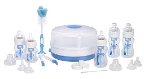 An ideal present for a Baby Shower party. This comprehensive set provides everything you need to feed a new born baby. The Dr. Brown's Natural Flow Wide-Neck Baby Bottles offer a wonderful feeding experience with innovative vent technology. Dr Brown's bottles use a patented 2-piece internal vent system for your baby's comfort. This system creates positive-pressure flow for vacuum-free feeding. The breast milk or formula flows freely without teat collapse. As the baby feeds, air is channelled from the teat collar through the vent system to the back of the bottle. Air never mixes with the breast milk or formula so oxidation is prevented, thereby maintaining essential vitamins such as C, A and E. The vent system eliminates air bubbles in the formula or milk, which helps to reduce feeding problems such as wind related colic. *Results of a HCP Colic Survey carried out by Consumer Analysis Ltd. For full details go to www.colicreport.com