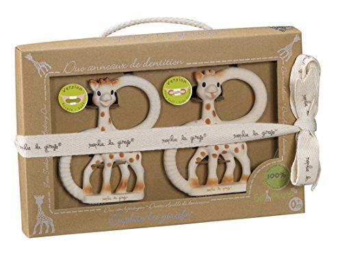 Once upon a time, a simple story...?The little giraffe was born on 25th May in year 1961...Saint Sophie's day.?In those days, the only animal toys available were farm animals or pet figures...?That is why one day in France a certain Monsieur Rampeau, who was an expert in transforming sap from the hevea tree using the rotational moulding of rubber as a toy-making concept, came up with the idea of designing a giraffe. Such an exotic wildlife figure would be a first on the market, and its size and shape would be ideal for a baby's small hands to grasp.?Sophie the Giraffe, who looked exactly the same then as she does today, went into production on Thursday 25th May.?She was an immediate success. Sophie quickly became a ?must have? in baby?s essentials. Designed to stimulate the senses and soothe teething gums, parents recognised right away the benefits of this little giraffe for their child.?By simple word of mouth, the little giraffe's fame spread.? Vulli, a company based in Rumilly in the Haute-Savoie region of France has created an extensive range of Sophie the Giraffe products to compliment the original toy and amuse and soothe babies from birth onwards. The So?Pure Teething Ring is made from 100% natural rubber and food grade paints just like Sophie herself. The Soft version is solid rubber and provides a firmer bite than the Very Soft version, which is hollow. The Duet pack comes with both versions enclosed. The So?Pure teething ring features a variety of textures to relieve baby at different stages of teething. Great for little hands to hold and ideal for soothing painful gums. Comes in a lovely gift box tied with ribbon, making it an ideal newborn gift.
