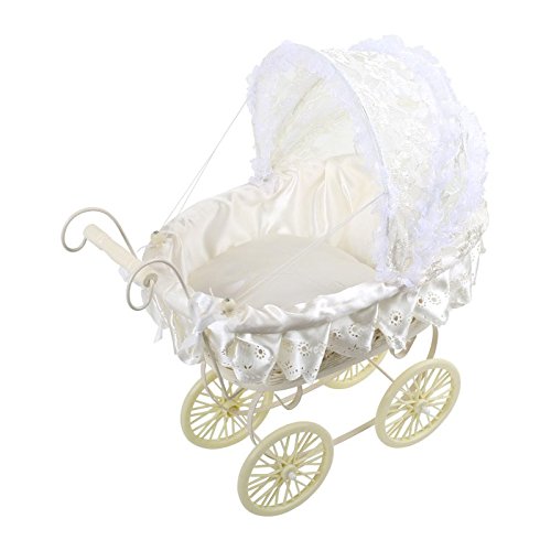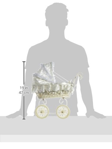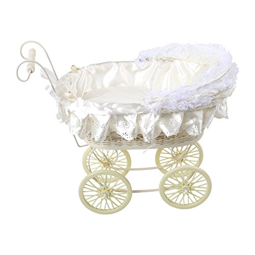 This white woven wicker pram on a metal frame with wooden wheels is a toy and a beautiful decoration style.
