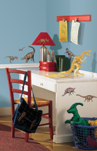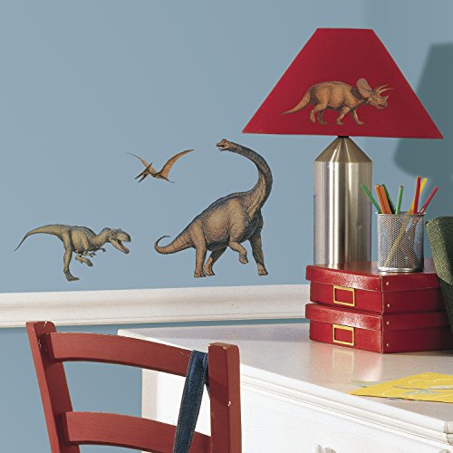 The Jurassic Age is here! These are realistic and beautifully painted Dinosaur Wall Stickers, removable and repositionable, that will plunge your room back to a time when these impressive animals walked the earth! Great for classrooms too.Decorating your child's bedroom/nursery has never been easier and more fun than with this set of removable and repositionable self-adhesive vinyl Dinosaur stickers.Roommates Wall Stickers are removable and repositionable within seconds and can be used on any smooth, dry & clean surface without leaving a sticky residue or mark. They are made from high-quality thin and flexible vinyl and printed on a clear material for a "stencilled" look. Can be applied on painted walls (Newly painted walls should be left at least 3 weeks to completely dry), furniture, accessories, tiles, mirrors, windows etc.Simply peel carefully from sheet. Then position it in the desired location making sure to remove all bubbles. To remove or reposition, slowly peel off the wall and re-apply in the new position.Contains a total of 16 large stickers measuring from 18 cm to 35 cm width presented on 4 sheets, each measuring 25.5cm x 46cm. For Size indication the Long Neck Diplodocus measures at 26cm H x 22cm W.Roommates Wall Stickers are made in the USA. Roommates is a division of York Wall coverings, America 's oldest and largest wallpaper manufacturer making wall coverings since 1895 in Pennsylvania.