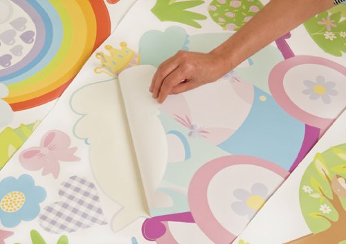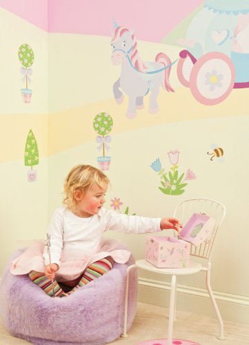 Transform a whole room into a fairy tale garden in minutes and bring a room to life, with these easy peel and stick room decorations. Each wall sticker kit contains 4 huge sheets filled with oversize vinyl stickers. Peel and position each removable sticker wherever you like to create your own fantastic themed room. Change the look whenever you like - quickly, easily and without making any mess. It's as easy as Peel - Stick - Decorate.Quick to apply, cleanly removable, re-stickable splash-proof and washable. Simply peel each pre-cut sticker and apply to any clean, dry surface - walls, doors, furniture, bathrooms and more. The results are amazing, giving the affect of a hand painted mural.Thanks to a unique adhesive, the images can be moved from place to place without damaging the surfaces, so when you are ready for a new look, just peel off the stickers and refresh with a new FunToSee theme. Ideal for home, schools, creches, hospitals, kids' clubs and more. The kit includes 66 princess themed room stickers, including (cms in height) Princess Sweetheart (40.5cm), Cupcake Castle (55cm), Unicorn and Carriage (upto 53cm ), Apple and Blossom Trees (upto 57cm), Apple Tree Branches (60cm), Rainbow and Sun (63.5cm), 12 Heart-shaped Raindrops (3.2cm), Frog on a Lilly Pad (26cm), 4 Patterned Flowers (26cm), 5 Flower Clusters and 2 Shrubs (upto 18.5cm), 3 Butterflies and 2 Dragonflies (upto 10cm), 6 Topiary Trees (27cm), Flower Vine (47.7cm) and Scene Setters - 6 Princess Bows, 3 Toadstools, 3 Fluffy Clouds, 2 Bees, 3 Birds and 6 Love Hearts. All this in a lovely presentation box with carry handle. You can even copy our layout design identically from the box. Our stickers are designed, manufactured and dispatched from the UK, and make the perfect present.