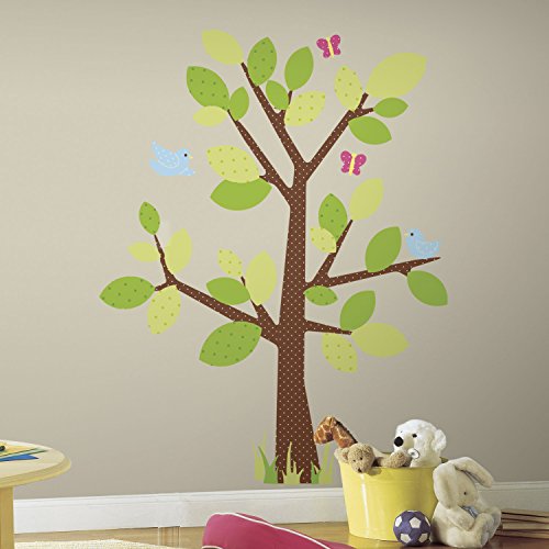 The ultimate trendy deco for any nursery or kids room. Like our Dotted Tree, this design features stylish leaves, birds, and butterflies, but packs a bigger punch with some extra patterned leaves and lighter colors. Because RoomMates remove and reposition easily, you can try many variations until you've grown the tree of your dreams. An easy way to give any room a sweet, earthy touch. Roommates Wall Stickers are removable and repositionable within seconds and can be used on any smooth, dry & clean surface without leaving a sticky residue or mark. They are made from high-quality thin and flexible vinyl. Can be applied on painted walls (Newly painted walls should be left at least 3 weeks to completely dry), furniture, accessories, tiles, mirrors, windows etc.Simply peel carefully from sheet. Then position it in the desired location making sure to remove all bubbles. To remove or reposition, slowly peel off the wall and re-apply in the new position.47 elements on 2 sheets. The assembled tree measures 127 cm x 91.7 cm. Decals range from 4.5cm x 4.5cm to 23.5cm x 25.5cmRoommates Wall Stickers are made in the USA. Roommates is a division of York Wall coverings, America 's oldest and largest wallpaper manufacturer making wall coverings since 1895 and based in Pennsylvania.
