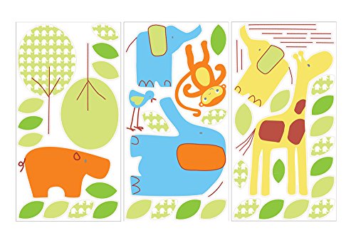 Create a vibrant, cheerful and natural Jungle scene containing Elephants, Monkeys, Birds and Giraffes with this pack of wall stickers. Use them to style your child?s room. Co-ordinates with the Jolly Jungle Gro-to-bed, Musical Mobile, Height chart Sticker Set, Nursery Set and?Mikey Monkey Comforter?from the?Gro Range. 3 separate sheets of stickers giving you a total of , 1 x hippopotamus sticker, 3 x elephant stickers, 1 giraffe sticker, 1 monkey sticker, 1 x bird sticker, components to make 1 x tree.