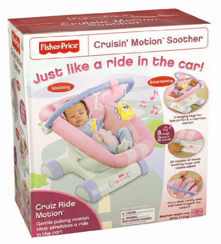 What happens when babies go for a ride in the car? They fall asleep. Now, you can give your baby that soothing feeling of a car ride, right at home. The first baby seat with Cruiz Ride Motion produces a gentle pulsing action designed to help baby relax and sleep. Add just-right seat ergonomics, soft fabric and a comfy head snuggler, and baby has the perfect spot to doze off, without getting in the car. When it's time to play, 2 activity toys and a large rearview mirror entertain. Requires 4D batteries.