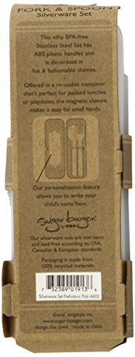 Sugar Booger?s aesthetic combines uncluttered design with contemporary graphics and colors, and the results can be seen throughout the company?s complete line of ?Happy Products for Good People?.? Product inspiration comes from real life. Each item is designed to help customers take care of the ones they love, and fill the needs of the people and pets that depend on them for care. The company?s manufacturing principles focus on environmentally friendly and recycled materials, quality construction, and providing great value at a fair price. BPA-free Stainless Steel Silverware set is packaged in a re-usable carry case that's perfect for packed lunches or play dates. A great way to maintain clean silverware or keep dirty silverware contained, the magnetic closure is fun and easy for little hands to operate. Also includes a space for writing your child's name in the front. Dishwasher safe, do not microwave. Non-toxic and lead-free according to United States, Canadian and European standards.