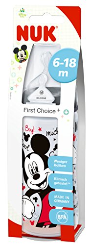 The NUK system combines all orthodontic benefits of the NUK teat shape with the feeling of breastfeeding--perfect for whenever you are unable to breastfeed. To ensure that feeding by bottle replicates breast feeding as closely as possible, NUK took a mother?s breast as their model when designing the NUK orthodontic teat shape. The unique NUK orthodontic shape was developed over 50 years ago after intensive research by two German orthodontists. Their research found that prolonged use of conventional round teats and soothers could cause oral abnormalities. They therefore decided to develop a teat that is based on the shape of a mother?s nipple during breast-feeding. The bottle is supplied with a Size 2 Anti-Colic Silicone Medium Feed Hole Teat, but it can be combined with all NUK First Choice products. The extra wide lip rest and the NUK Anti-Colic Air System make drinking as natural as possible. The bottle?s extra wide neck makes it easy to fill and clean, whilst its slightly curved shape makes it easy to hold securely. It is BPA-free so you can be assured that it is free from any harmful substances This bottle is part of the NUK Disney Mickey and Minnie collection and features a classic Disney design.
