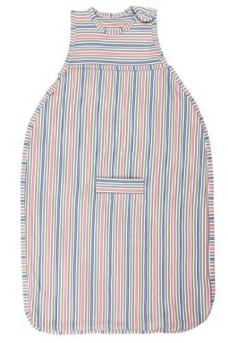 The Merino Kids organic cotton bag baby sleeping bag features the same award-winning design as Merino Kids merino sleeping bags, with two layers of organic cotton pin-stripe interlock fabric, 100% natural and GOTS-certified organic, grown pesticide-free and manufactured without the use of harmful chemicals.Design Features:Patented safety belt aperture enables safe travel in stroller or car seat.Baby has freedom to move naturally and room to grow yet they can't slip underneath, nor wriggle out and wake up cold.Contoured bodice stays clear of face.Full-length self-locking zipper down one side, away from face. Zipper sewn inside lining so won't scratch.Opens up flat for easy dressing. Unzips bottom-up for quick diaper changes.Fits growing child safely and comfortably for up to two years. Quality workmanship ensures years of wear. Excellent value compared to other sleeping bags that last only a few months.Two sizes, 0-2 years and 2-4 years.