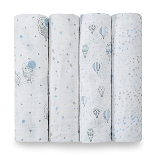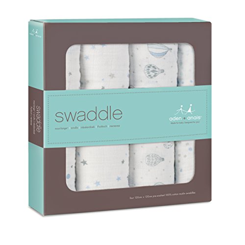 Pack of four 100% cotton muslin swaddling blankets. aden + anais wraps are the ultimate in breathability and softness. The fabric?s light, open weave allows a baby?s body temperature to regulate itself naturally in order to prevent overheating, so that a swaddled baby stays cool in the summer and warm in the winter. It is gentle on baby?s skinand durable for everyday use, as the more you wash it, the softer it gets. aden + anais wraps are a generous size, measuring 120cm X 120cm , so that new and seasoned moms alike can swaddle babies of all sizes with ease. In addition to the common use as a swaddling wrap, aden + anais wraps are versatile, useful as burp cloths, nursing shields, stroller covers to protect from sun, cold, wind or insects, portable crib sheets, stroller and car seat liners, tummy time blankets, change table covers, and more.