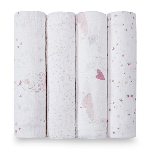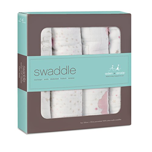 Pack of four 100% cotton muslin swaddling blankets. aden + anais wraps are the ultimate in breathability and softness. The fabric?s light, open weave allows a baby?s body temperature to regulate itself naturally in order to prevent overheating, so that a swaddled baby stays cool in the summer and warm in the winter. It is gentle on baby?s skinand durable for everyday use, as the more you wash it, the softer it gets. aden + anais wraps are a generous size, measuring 120cm X 120cm , so that new and seasoned moms alike can swaddle babies of all sizes with ease. In addition to the common use as a swaddling wrap, aden + anais wraps are versatile, useful as burp cloths, nursing shields, stroller covers to protect from sun, cold, wind or insects, portable crib sheets, stroller and car seat liners, tummy time blankets, change table covers, and more.