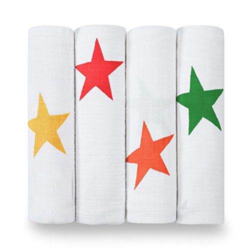 Pack of four 100% cotton muslin swaddling blankets. aden + anais wraps are the ultimate in breathability and softness. The fabric?s light, open weave allows a baby?s body temperature to regulate itself naturally in order to prevent overheating, so that a swaddled baby stays cool in the summer and warm in the winter. It is gentle on baby?s skinand durable for everyday use, as the more you wash it, the softer it gets. aden + anais wraps are a generous size, measuring 120cm X 120cm , so that new and seasoned mums alike can swaddle babies of all sizes with ease. In addition to the common use as a swaddling wrap, aden + anais wraps are versatile, useful as burp cloths, nursing shields, stroller covers to protect from sun, cold, wind or insects, portable cot sheets, stroller and car seat liners, tummy time blankets, change table covers, and more.