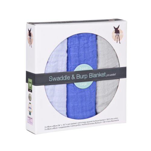 The multi-functional Swaddle & Burp blanket from L?SSIG is made of 100% woven cotton. All Lassig Swaddle & Burp cloths are made from the finest cotton and come prewashed so they feel wonderfully soft next to baby's skin and won't shrink when washed. The Swaddle & Burp Blanket from Lassig feature cheerful prints and many different colour options for boys, girls or neutral. The cloths are available in double or triple pack and come in a range of sizes. Chose from 85cm x 85cm for younger babies, the generous sized 120x120cm for older babies or the triple layered cozy blanket 120cm x 120cm which is fully breathable and suitable for use from birth.The Swaddle & Burp blanket from Laessig can be used as a swaddle wrap for younger babies when sleeping. Throw it over your shoulder to use as a burp cloth. Alternatively, you can use it as a cover or wrap when feeding or as a cuddly nursing blanket. When out in the sun or wind, these versatile Swaddle & Burp cloths are also ideally used to shade your baby in his./her stroller or car seat. Take one with you when you go out and you can use it as a cover for changing tables, play surfaces or cold table tops. Many babies adopt their cozy Swaddle & Burp cloth as a comforter so you need to have a few on hand at all times! Made from 100% fine cotton, the Swaddle & Burp blanket from Laessig comes pre-washed to minimise shrinkage. It is recommended to wash your Laessing saddle & burp cloth at no more than 40". Please follow care instructions.
