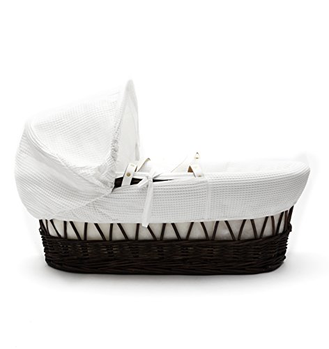 The white waffle on dark wicker moses basket uses only the finest luxury waffle creating a perfect atmosphere for your little one. With its contrasting Dark Wicker surround, this basket is perfect in any household. Suitable from newborn to 6 months, this moses uses plush polycotton, with a Luxury surround padding. It also includes a comfortable mattress and an adjustable hood perfect to create a cosy sleeping space for your precious little one. The mattress is water resistant and breathable allowing easy air movement and heat dissipation around your baby's body keeping them cosy all night long. The mattress is also washable, just incase of any spillages! A good balance between comfort and style, The White Waffle Wicker moses basket will ensure safe and sound sleeping for you and your baby. (stand sold seperately)