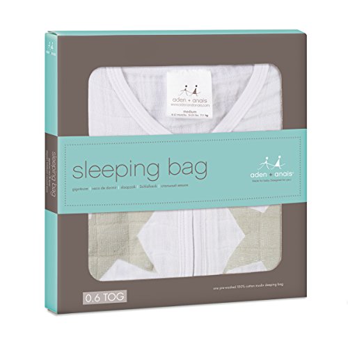 Single 100% cotton muslin sleeping bag 0.6 TOG. aden +anais sleeping bags are designed to be worn over a baby?s pajamas, ensuring a safe night?s sleep by eliminating loose cot blankets, which can be dangerous. These lightweight sleeping bags are perfect for keeping your baby at the right temperature, as muslin?s light, open weave allows air to circulate around the baby?s body. aden + anais sleeping bags offer the ultimate in breathability and softness, as the more the more you wash them, the softer they get. Each sleeping bag zips from the bottom, making nappy changes easy, and a strip of muslin over the zipper by baby?s face provides extra comfort. aden and anais award-winning sleeping bags are the perfect sleepwear to follow our popular swaddling blankets.