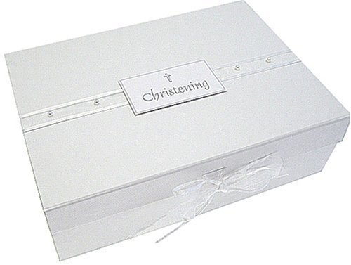 Our most elegant Christening range.A4 sized top quality cord covered ridged box with white organza ribbon and 4 elegant white pearls. A quality white cord card plaque is inbetween the pearls which reads 'Christening'. The box has 2 magnets on the flap to keep it shut. But also ties with a gorgeous white ribbon for simple beauty. It is made in England and is perfect to keep those sweet memories safe forever.