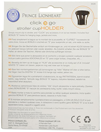 This expandable cup holder works with most drink cups, cans or bottles. A swivel base ensures drinks are kept level and mounts to horizontal, vertical and diagonal tubes. Simply mount the clip to the pushchair and click the cup holder in or out as required. Pack also includes four S hooks for hanging bags, jumpers and more. Prince Lionheart products - from our family to yours.