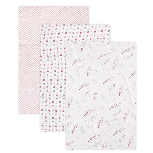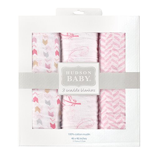 • Hudson Baby Muslin Swaddle Blankets, Pink Feathers