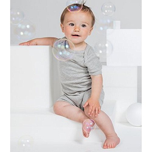 Babybugzサイズガイド:3-6ヶ月(身長60-66cm)、6-12ヶ月(身長66-76cm)、12-18ヶ月(身長76-86cm)、18-24ヶ月(身長86-93cm)、2-3歳(身長92-98cm)。先染めストライプ。エンベロープネック。股下全開スナップボタン留め。はがせるラベル。手洗いのみ。素材: OCS認証オーガニックコットン100%。