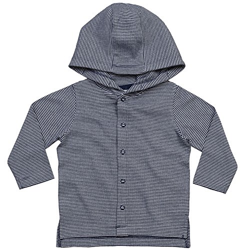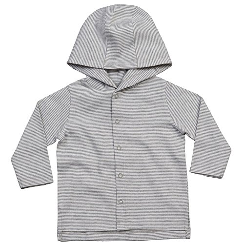 Babybugzサイズガイド:3-6ヶ月(身長60-66cm)、6-12ヶ月(身長66-76cm)、12-18ヶ月(身長76-86cm)、18-24ヶ月(身長86-93cm)、2-3歳(身長92-98cm)。先染めストライプ。フードつき。前全開スナップボタン留め。袖口・裾は2本針ステッチ。はがせるラベル。手洗いのみ。素材: OCS認証オーガニックコットン100%。