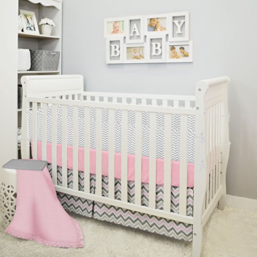 Chevron Pink and Gray Set includes: Fleece Blanket, Crib Skirt, 4 sided bumper and 2 fitted sheets, 1 pink and 1 gray;Fleece blanket measures 30 x 40; it is ultra soft with a 2 satin trim. Great traveling blanket that will keep your baby comfortable and warm;Fitted sheets are made of 100% cotton jersey and fit a 28 x 52 crib mattress and have 9 corner pockets; softness and stretchability of jersey knit is perfect for baby's soft skin and makes late night changes easier;Pleated crib skirt is 100% cotton percale and has a 14 inch drop;Bumper is 10 high to protect your baby's head from the crib rails and is made with 100% cotton percale fabric; machine wash and dry