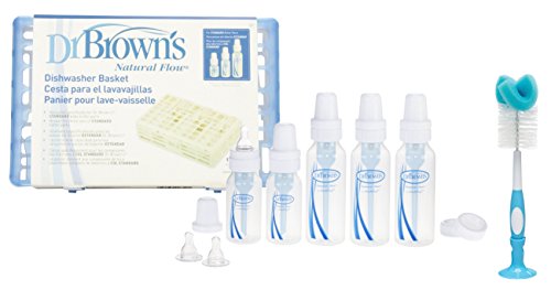 Dr. Brown's Natural Flow Bottle Newborn Feeding Set with Dishwashing Basket and Bottle Brush (Includes Bonus Baby Haven Reusable Steam Sterilizer Bag)
