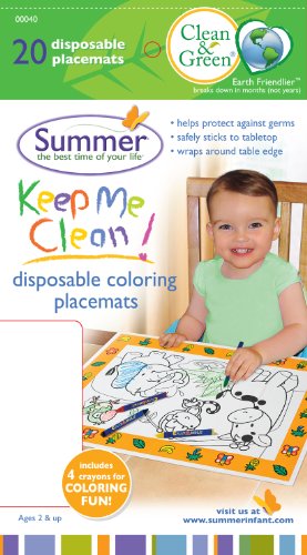 Summer Infant's Clean & Green Disposable Placemats are made of 80% calcium, a mineral found in nature. Not only will these mats prevent your children from picking up germs from a dirty table, but they'll inspire creativity! Each entertaining mat has a black and white design begging to be coloured (four crayons included). Comes in a re-sealable travel pouch for added convenience. Fun and functional these placemats are a must for your changing bag.
