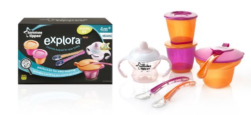The Explora Weaning Kit (designed for girls from 4 months onwards) contains all the equipment you need to start the transition from a milk-only diet to solid foods. The First Sips Cup has been designed for easy use for children, with a soft spout which is kind to gums, an easy-to-open valve, and small handles for babies. The cup is also non-spill, so that when dropped on the floor there is no mess to clean up. The First Weaning Spoons have been designed to help your baby learn to feed with a spoon. They are ideal for first feeds such as baby rice and purees, and their soft collapsible silicone base means that your baby will get a fuller feed whist learning to take food from a spoon. The Cool and Mash Bowl has a unique lip, where you can rest food until it cools down or mash food to make it a finer texture. It also comes with a leak-proof lid and spoon for travel, and has an easy scoop triangular base to make feeding easy. The Pop-Up Weaning Pots are great to store or freeze larger portions of food. They come with an easy push-up base and leak-proof lids, and can be stacked so they save space. All items are steriliser, microwave, and dishwasher safe, and as with the whole Explora range are BPA-free.