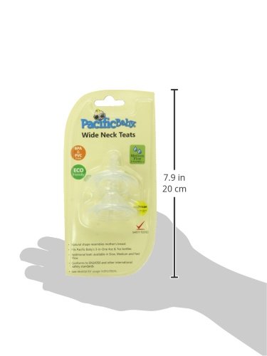These 2 count wide neck teats are compatible with Pacific Baby 3-in-One Thermal Baby bottles (4oz and 7oz). They are made out of high grade soft silicone and designed with the natural shape of a mother?s breast in mind. The medium teats are suitable for babies aged approximately 3 months and up. When you baby is ready to move up to the next teat stage the medium teat can be replaced with the fast flow. The teats are BPA and PVC free and have passed the relevant safety tests. Always test the temperature of liquid before feeding your child. A Handle/Spout set and Toddler Drink Top are also available by Pacific Baby which increase the product life of the thermal bottles for up to five years during your child?s toddlerhood and early primary years. The 3-in-One Thermal bottles by Pacific Baby will keep your child?s drink warm or cold for up to 6 hours (4 ounce bottle) or 10 hours (7 ounce bottle) which is extremely useful when you are out and about.