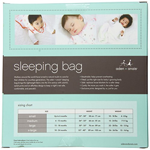 Single-layer 100% cotton muslin sleeping bag. aden +anais sleeping bags are designed to be worn over a baby?s pajamas, ensuring a safe night?s sleep by eliminating loose crib blankets. Muslin?s light, open weave allows a baby?s body temperature to regulate itself naturally, helping to prevent overheating. aden + anais sleeping bags offer the ultimate in breathability and softness; the more the more you wash them, the softer they get. The sleeping bag zips from the bottom to help with nighttime nappy changes. A strip of muslin over the zipper by baby?s face provides extra comfort.