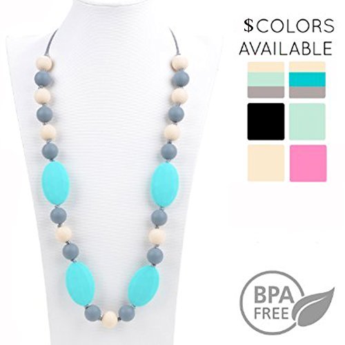 SAFE. 100% BPA-Free FDA Food Grade Silicone Beads. Meets CPSIA, CE, and international standards for BABY SAFETY. Dishwasher safe to keep baby germ free.;MOMS AND BABIES LOVE IT - The soft, stimulating texture of the necklace soothes the pain of teething. It keeps your infant distracted and engaged while in your arms. Provides a closer bond between you and your baby while looking like the stylish mom;SAFETY FIRST. Break-away clasp and individually-knotted beads for safety. Alternative to Baltic amber necklaces, freezer teething rings, chew keys, and teether toys.;EASY TO CLEAN - Necklace can be wiped clean with soap and water and is dishwasher top shelf safe - no more worries about nasty germs or dirt;YOUR NEW FAVORITE NECKLACE is eye-catching, won't pull your hair, and the length can be adjusted. Length is 30/14 drop. Great breastfeeding nursing necklace and sensory toy for baby, too! 100% satisfaction guaranteed! Best baby shower gift for new moms!