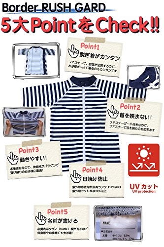 - ✅【 作り込まれたラッシュガード 】 前開きファスナー付きで、首の前と内側には、ファスナーガードが付いるので、直接ファスナーが肌に触れない様になっています。また、丈は少し長めで、お子様が座り込んで砂遊びをしたりしても、背中が出ない様なデザインになっています。袖は短過ぎない5分丈で、動きやすさを確保しつつ、腕を日焼けから守ります。 .