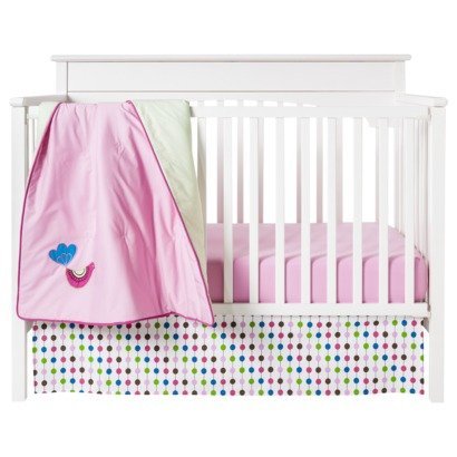 10-piece Crib Set Includes Comforter, 2 Crib fitted sheet, Dust ruffle, Diaper Tacker, Valance, Mobile, and 3 piece Wall Hanging Set.;The comforter is reversible, one side with pink fabric with embroidered bird and other side has solid green.;100% cotton percale fabric with lofty polyester fill;Machine Washable;Must for your little angels room