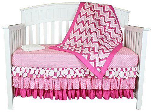 This 100% cotton 4-In-1 crib bedding collection provides everything you need to create four unique looks for your baby girl's nursery, each more stunningly beautiful than the last; 4 piece set includes reversible coverlet, dust ruffle, and two different fitted sheets;The 44 by 33 inch coverlet will be your daughter's (or your) favorite for years to come; 100% cotton fabrics feature a stunningly beautiful pink, fuchsia, and white chevron pattern on one side, and a fun-loving big dot design on the other side; its lightweight warmth will have you finding unending uses for it in and out of the nursery;Clearly the star of this collection, the triple-layered crib skirt features more 100% cotton fabric than we have ever seen in a crib skirt, all gathered and ruffled to create a truly elegant look; heavy-duty under-mattress platform will hold up through frequent sheet changes; 14 inch drop;Two 100% cotton fitted crib sheets are designed to fit a standard sized crib mattress of 52 inches by 28 inches; all around elastic assures a safe and secure fit every time;Premium natural fabrics, beautiful designs, stunning color combinations of pink and fuchsia, optional decorating choices; the perfect choice for your little baby girl; machine wash and dry
