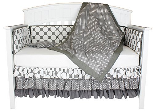 This 100% cotton 8-In-1 crib bedding collection provides everything you need to create eight unique looks for your baby girl's nursery, each more beautiful than the last; 5 piece set includes reversible coverlet, reversible bumper, dust ruffle, and two different fitted sheets;The 44 by 33 inch coverlet will be your daughter's (or your) favorite for years to come; 100% cotton fabrics feature a beautiful white pin dot on grey pattern on one side, and a fun-loving big dot design on the other side; each side is perfectly framed by a grey border; its lightweight warmth will have you finding unending uses for it in and out of the nursery;Clearly the star of this collection, the triple-layered crib skirt features more 100% cotton fabric than we have ever seen in a crib skirt, all gathered and ruffled to create a truly elegant look; heavy-duty under-mattress platform will hold up through frequent sheet changes; 14 inch drop;Two 100% cotton fitted crib sheets are designed to fit a standard sized crib mattress of 52 inches by 28 inches; reversible bumper has top and bottom ties for a perfect installation;Premium natural fabrics, beautiful fun-loving designs, popular grey and white color combination, optional decorating choices; the perfect choice for your little baby girl; machine wash and dry