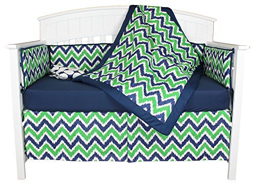 This 100% cotton 8-In-1 crib bedding collection provides everything you need to create eight unique looks for your baby boy's nursery; 5 piece set includes reversible coverlet, reversible bumper, dust ruffle, and two different fitted sheets;The 44 by 33 inch coverlet will be your son's (or your) favorite for years to come; 100% cotton fabrics feature a green and navy blue on white chevron pattern on one side, and a fun-loving big dot design on the other side; each side is perfectly framed by a deep blue border; its lightweight warmth will have you finding unending uses for it in and out of the nursery;The pleated crib skirt features 100% cotton fabrics with a contemporary take on the popular zig zag pattern in green, navy blue and white; 14 inch drop;Two 100% cotton fitted crib sheets are designed to fit a standard sized crib mattress of 52 inches by 28 inches; reversible bumper has top and bottom ties for a perfect installation;Premium natural fabrics, fun-loving designs, popular green and blue color combination, optional decorating choices; the perfect choice for your little baby boy; machine wash and dry