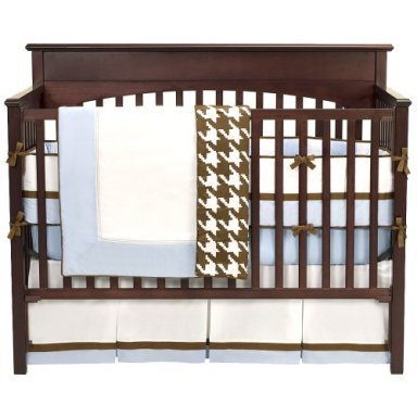 Metro Blue/White/Chocolate Crib Bedding Set;Includes throw, bumper guard, crib skirt, and crib sheet;Machine Washable
