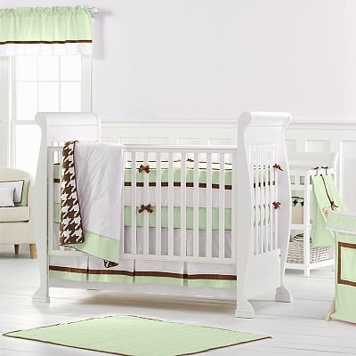 Lime/White/Chocolate Crib Bedding Set;Includes throw, bumper guard, crib skirt, and crib sheet;Machine Washable