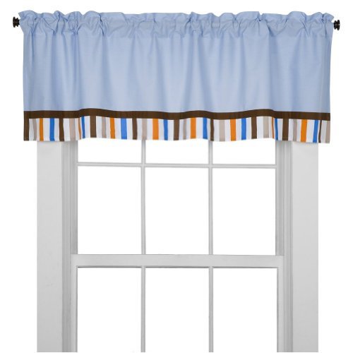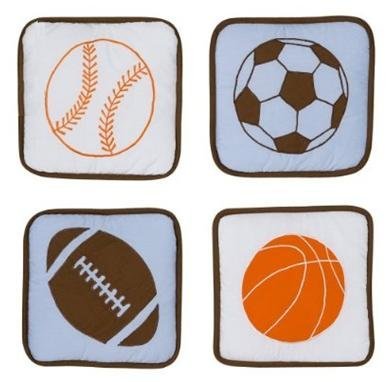 Modern Sports Theme;Blues, Brown with Orange Accent;Includes Crib Skirt, 2 Crib Fitted Sheets, Crib Comforter, 4 pc Wall Hanging Set, Window Valance, Diaper Stacker;FREE MUSICAL MOBILE included in the set