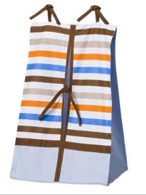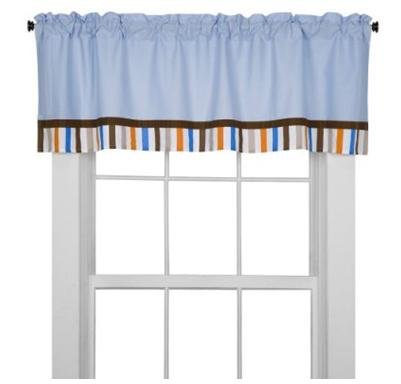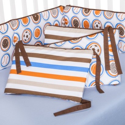 Modern Sports Theme;Blues, Brown with Orange Accent;Includes Bumper Pad, Crib Skirt, Crib Fitted Sheet, Crib Comforter, 4 pc Wall Hanging Set, Window Valance, Diaper Stacker;FREE MUSICAL MOBILE INCLUDED IN THIS SET