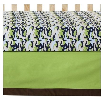 Includes Comforter, 2 Crib sheets, Crib skirt, Valance, Diaper stacker;Crib sheet: 100% cotton percale in camo print with elastic on 4 corners;Comforter: Patchwork embroidery with nice chorded edge;Made with 100% cotton percale fabrics with polyester filling where needed;Machine Washable