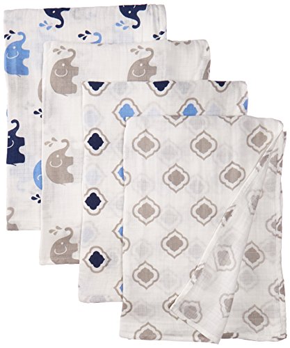 Bacati Elephants Set of 4 Muslin Swaddling Blankets, Blue/Grey