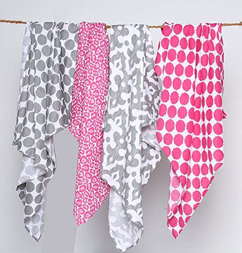 Wrap your baby in warmth with this super soft Pink and Grey Swaddling Muslin Blanket. It includes four oversize swaddling blankets. One pink dots, one pink leopard, one grey dots and one grey damask. It is also available in different Ikat prints in Blue, and Chocolate. These blankets are lightweight, Open Weave, Prewashed soft cotton swaddling blanket Breathable; helps reduce the risk of overheating, ideal for warmer climates. It・E?・Es machine washable and gets softer with every wash