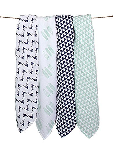 Color:Aqua Bacati - Noah Tribal Mint/Navy Buck/Feathers/Triangles 100% Cotton Muslin Swaddling Blankets, Set of 4: Includes 4 oversize swaddling blankets, 100% Cotton breathable muslin Fabric. These blankets are lightweight, Open Weave, Prewashed soft Cotton swaddling blanket Breathable; helps reduce the risk of overheating, ideal for warmer climates. Dimensions: generously sized to 45 x 45 inches. Coordinates with the Bacati - Tribal and Aztec Bedding Collection. Multipurpose use as Burp Cloth, Tummy time, Play mat, Stroller Cover. Size; 45 x 45 inches, It includes four oversize swaddling blankets. Age Range: birth to 6 years. Care: Machine Washable, gets softer with every wash. Imported. Cotton is Breathable, making it more comfortable in extreme climates. Cotton is inherently soft on baby's delicate skin, durable and user friendly. Cotton's gentle quality makes it appropriate for babies with very sensitive skin or skin allergies. Cotton Muslin is breathable, comfortable and inherently very soft.