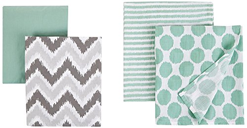 Color:Mint and Grey Bacati Ikat Mint/Grey Dots/Stripes 4 Crib set with 2 super soft Muslin Blankets. Includes Crib fitted sheet, Dust ruffle, and 2 muslin Blankets. Crib sheet, Size: 52 x 27.5 x 7'and crib skirt Size: 52 x 27・?・ with 13・?・ drop (Fits Us Standard Cribs) are made of soft 100% cotton percale fabrics. Blankets Size: 42 x 42・?・are made of soft muslin fabric. The Muslin blankets are lightweight, Open Weave, Prewashed soft cotton swaddling blanket Breathable; helps reduce the risk of overheating, ideal for warmer climates. Blankets has multiple uses; as a burp cloth, tummy time blanket, nursing and stroller cover, changing pad cover and much more. It is machine washable and gets softer with every wash. It coordinates with the rest of Bacati Ikat Bedding Collection. See the entire rest of Bacati Ikat Collection for endless Mix N match possibilities. Cotton is a green fabric as it is renewable resource & biodegradable. Cotton is breathable making it more comfortable in extreme climates. Cotton is inherently soft delicate on skin of babies, durable & user friendly. Cottons gentle quality makes it appropriate for Babies with very sensitive skin or skin allergies.