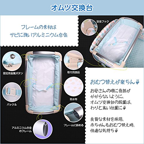 - 5大付属品(天蓋蚊帳、マットレス、オムツ交換台、物入れカゴ、揺り器)付き