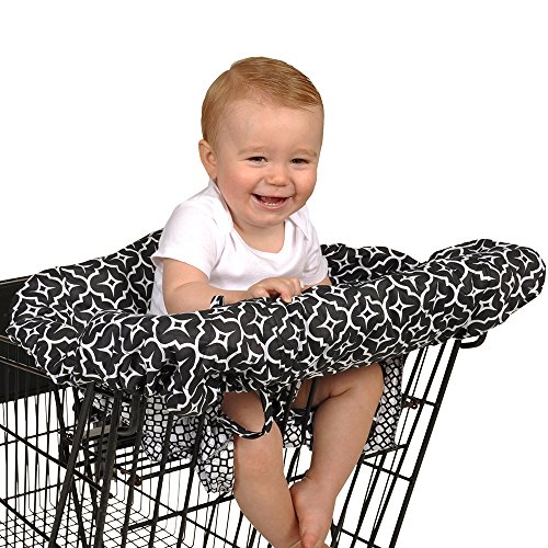 Doubles as a shopping cart or restaurant high chair cover; soft quilted material provides a secure environment for babies with a 360 degree germ-free zone;Combining simplicity and convenience, the cover features four elastic corners that secure it while providing easy one-hand installation; folds up so small that it can fit in your diaper bag so you will always have it with you;Wide safety strap comfortably keeps baby secure while attaching the cover to a shopping cart or high chair;Toy loops allow you to attach baby's favorite playthings;Beautiful 100% cotton fabrics features a bold black and white lattice pattern