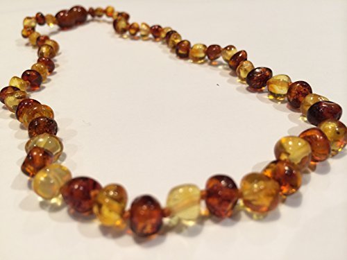 Necklaces are approximately 12.5 inches for babies and toddlers. Certified Authentic and shipped with certificate Teething Necklaces are not for baby to chew on, the Amber releases microscopic amounts of oil, as it warms with the body's natural temperature, that is absorbed into the skin and bloodstream. Baltic Amber contains succinic acid (anti-fever, anti-inflammatory), the compound that gives Baltic Amber teething necklaces the therapeutic quality. Teething Necklaces should be removed during naps and when unsupervised. Baltic amber is an organic substance, a "fossil resin" produced by pine trees which grew in Northern Europe. By having the baby wear the necklace everyday it helps reduce the common symptoms related to teething such as: red cheeks, fever, swollen gums, and diaper rash.