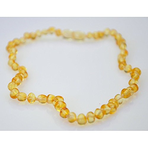 Baltic amber will help calm a baby without resorting to drugs.;Individual knots tied in between each bead with a plastic twist screw clasp.;Necklace measures approximately 12.5-13 inches long.