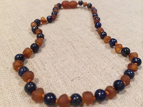 ADHD Raw Unpolished Baltic Amber Teething Necklace Babies (Cognac Brown) - Baby, Infant, and Toddlers will all benefit. Polished Anti Flammatory, Drooling & Teething Pain Reduce Properties - Natural Certificated Oval Baroque Round Baltic Jewelry with the Highest Quality Guaranteed. Easy to Fastens with a Twist-in Screw Clasp Mothers Approved Remedies! Helps some with stress, anxiety, colic, eczema, ADHD, acid reflux, GERD, gut issues, and heartburn. (Raw Coganc Lapis Lazuli) by Baltic Essentials