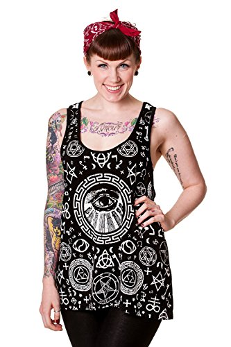 The Pentagram Black Vest is in the Goth/Emo style. It is extra long and can be teamed with jeans or leggings. The vest shape features cut back sleeves and a low cut neck. The vest is in black with an eye catching pentagram print on the front. The versatility of the piece makes it a must for lovers of Goth/Emo/Alternative clothing. Wear this one down the street and you will turn heads wherever you go.